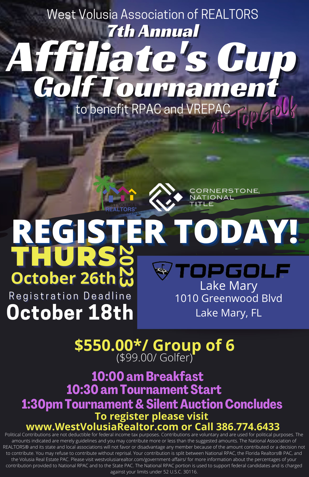 Join the WVAR 2023 PAC Committee for the 7th annual Affiliate's Cup Golf Tournament to benefit the PAC! This year's tournament will be held at TopGolf again this year and is the perfect opportunity to come out and see your fellow WVAR members while supporting a great cause...your Real Estate Industry!Images