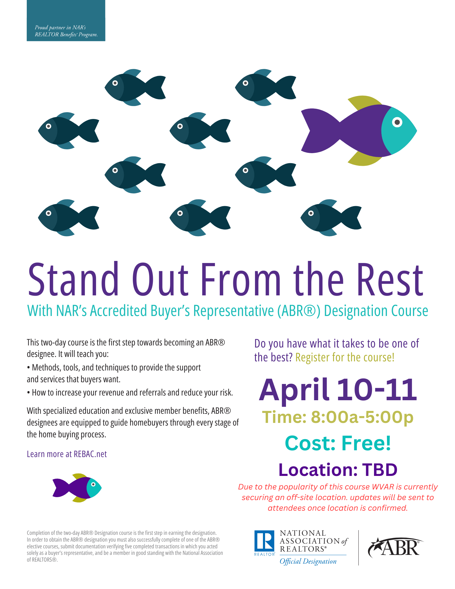 The Accredited Buyer’s Representative (ABR®) Designation Course establishes a foundation of training, skills, and resources to help you succeed as a buyer’s representative. Topics Covered: -Conveying your value to the buyer-client -Conducting a seamless, productive buyer counseling session -Guiding a buyer-client through the search-showing-selection process -Negotiating buyer-clients’ offers -Bringing the transaction to a successful close -Providing exceptional service.