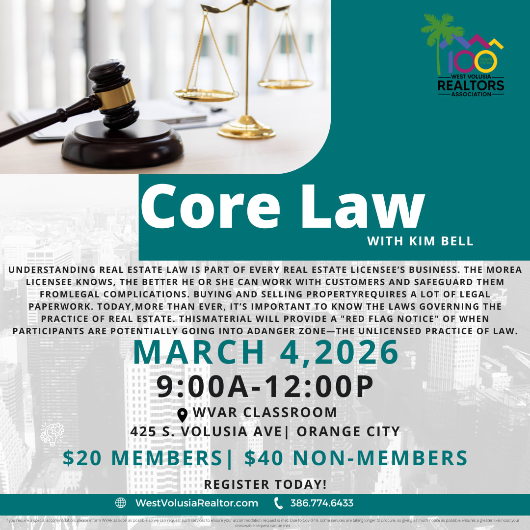Laws governing real estate are complex and varied. This course provides an advanced look into real estate law beyond the basic sales associates’ course. This course is not designed to make participants legal experts, but rather to help them identify and understand legal issues that arise. The more a licensee knows, the better he or she can work with customers and safeguard them from legal complications. This understanding will also help licensees avoid serious complications and minimize risk for themselves and their brokers. Buying and selling property requires a lot of legal paperwork. Today, more than ever, it’s important to know the laws governing the practice of real estate. Knowledgeable sales associates can minimize their legal risk by disclosing and documenting disclosures, by anticipating buyer’s remorse, by anticipating areas of liability, and by not creating false expectations. Objectives: After taking this class students will be able to: •Identify the requirements by law regarding listing agreements. •Explain the differences between Independent Contractor and Employee status. •Describe the activities a licensed assistant may perform and those that an unlicensed assistant may not. •Demonstrate a working knowledge of the types of property ownership rights and the limitations to those rights. •Describe the various property ownership types and the concurrent ownership tenancies. •Identify two benefits provided to owners of principal residences by the Constitutional Homestead in Florida. •Define and describe the various types of liens on property. •Demonstrate knowledge of the Sherman Antitrust Act of 1890, its implications and penalties. •Identify the requirements imposed by the Federal CAN-SPAM Act. •Describe the Real Estate Settlement Procedures Act, what it covers, and the disclosures required by the law. •Explain elements of the Truth in Lending Act. •Identify the disclosure requirements included in the Residential Lead-Based Paint Hazard Reduction Act of 1992
