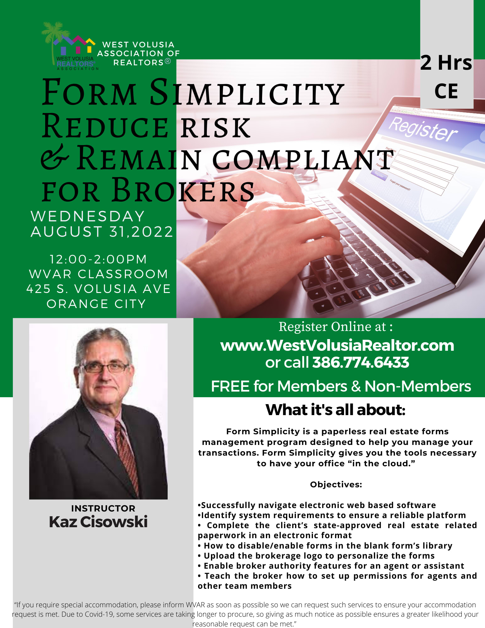 Cancellations not received within 24 hours prior to class start time will result in the forfeiture of the registration fee. Cancellations can be made by contacting WVAR at 386.774.6433 or emailing at education@westvolusiarealtor.org