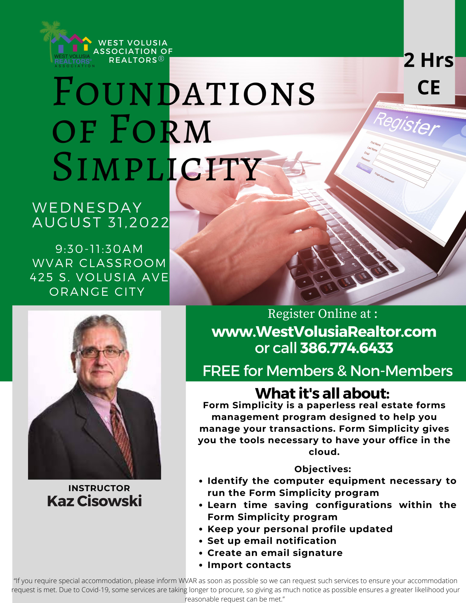 Cancellations not received within 24 hours prior to class start time will result in the forfeiture of the registration fee. Cancellations can be made by contacting WVAR at 386.774.6433 or emailing at education@westvolusiarealtor.org