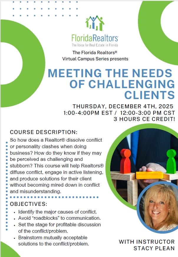 How does a Realtor® dissolve conflict or personality clashes when doing business? How do they know if they may be perceived as challenging and stubborn? This course will help Realtors® diffuse conflict, engage in active listening, and produce solutions for their client without becoming mired down in conflict and misunderstanding. The lessons will provide professional and effective means for learning how to work with wide-ranging personality types and dispositions.Images