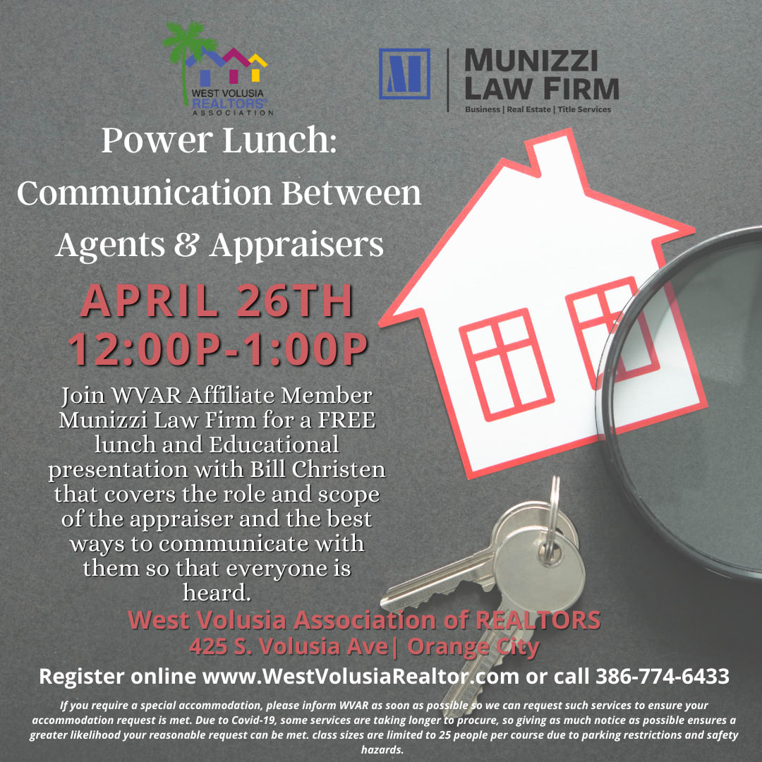 Join WVAR Affiliate Member Munizzi Law Firm for a FREE lunch and Educational presentation with Bill Christen that cover the role and scope of the appraiser and the best ways to communicate with them so that everyone is heard.Images