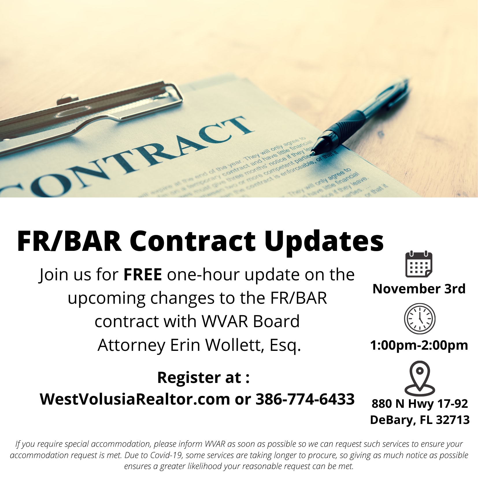 Join us as we welcome WVAR Attorney Erin Wollett, Esq. of Wright and Casey P.A. to discuss the real estate contract changes that will take effect on November 1st.