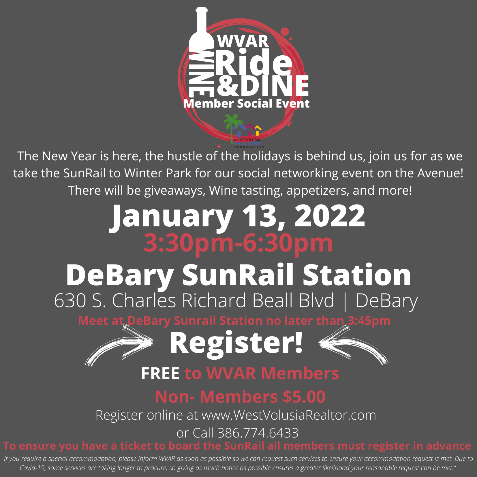 The New Year is here, the hustle of the holidays is behind us, join us for this FREE event as we take the SunRail to Winter Park for our social networking event on the Avenue! There will be giveaways, Wine tasting, appetizers, and more!